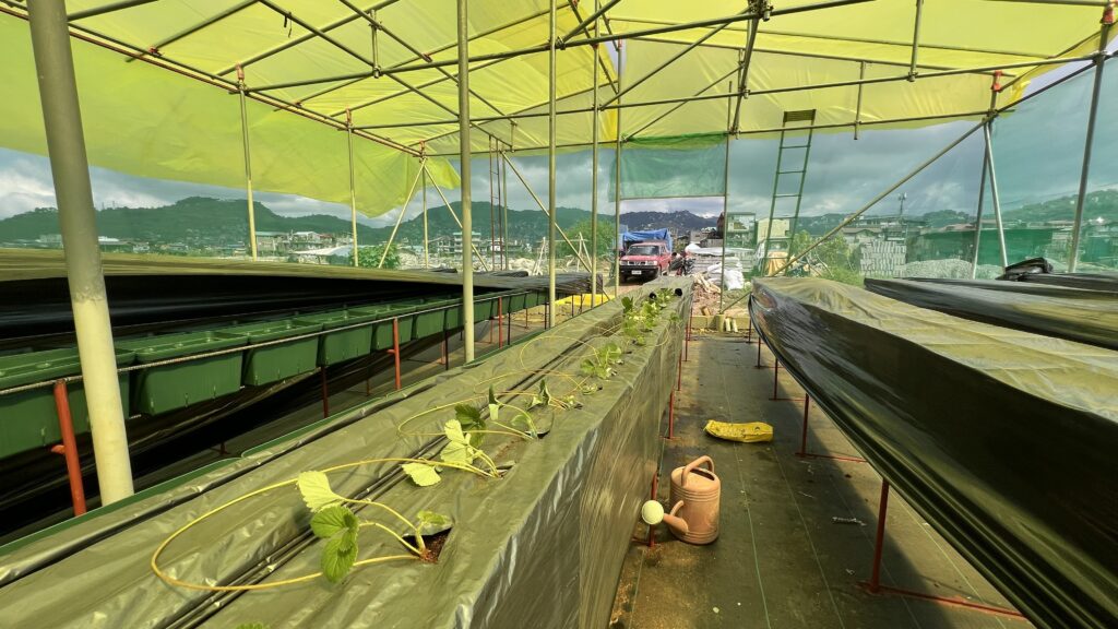ビニールハウスを建設中の様子を見に来たのだが、ほぼ外観はできていて、